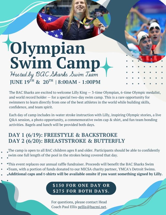 Kick off our 2026 Shark season with Coaches, Swimmers, and Parents. Great opportunity to ask questions, learn more or just hang out with Sharks! The Bloomfield Hills Sports Shop will be onsite so swimmers can try-on swimsuits and apparel. Dinner will be offered. Please sign up via the BAC web portal or App.