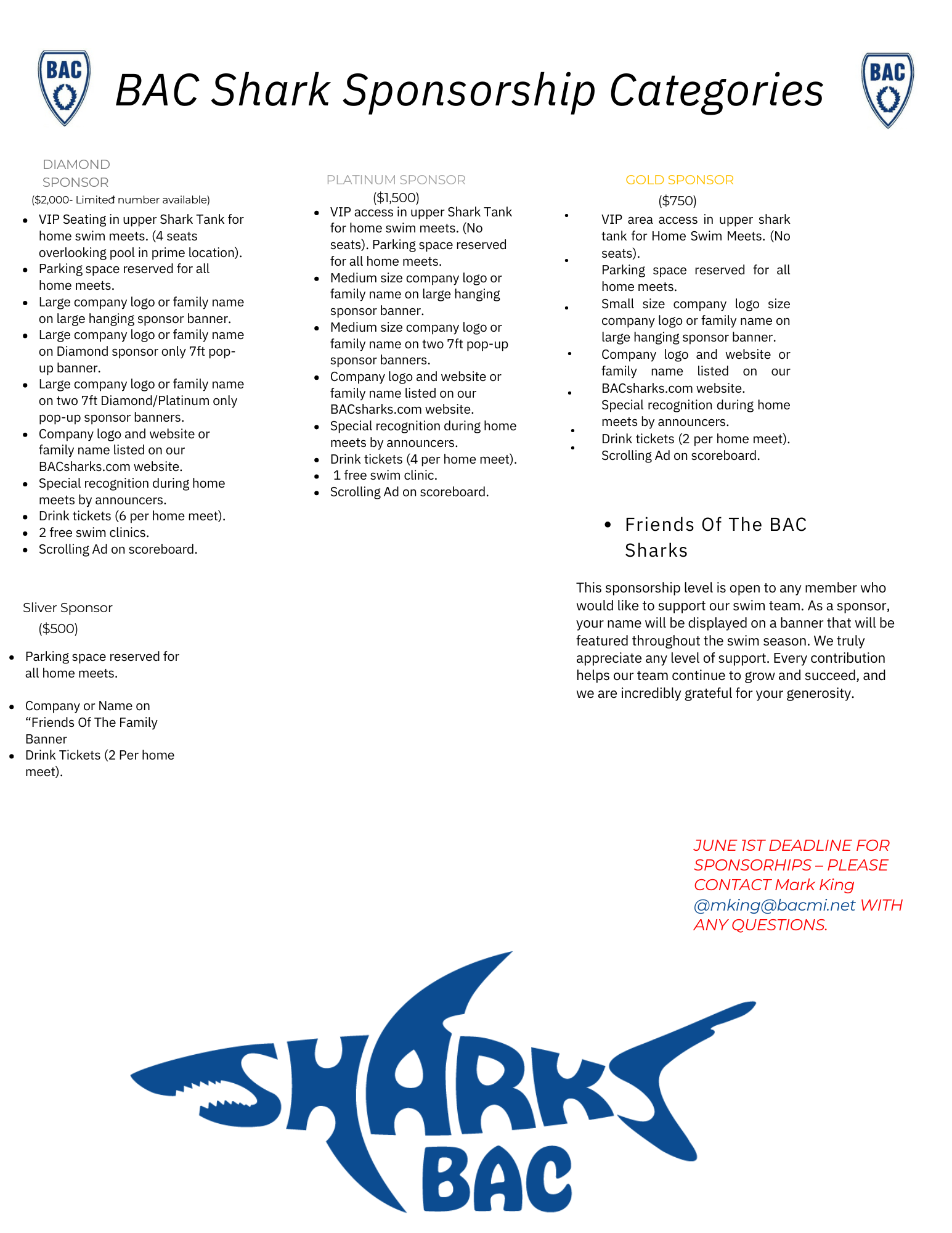 Contact Assistant General Manager, Mark King (mking@bacmi.net) if you are interested in a sponsorship. Thank you in advance for supporting our team.